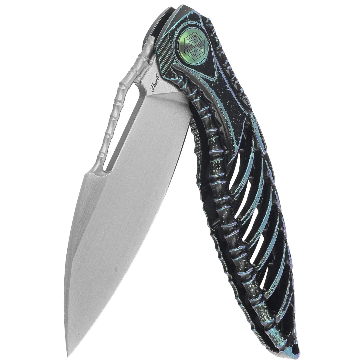 - Thor6 Black / Green Titanium, Satin – futurystyczny nóż składany premium z tytanową rękojeścią typu integral i głownią ze stali M390, łączący biomechaniczną estetykę z funkcjonalnością EDC. Artystyczna forma i techniczna precyzja w jednym.
