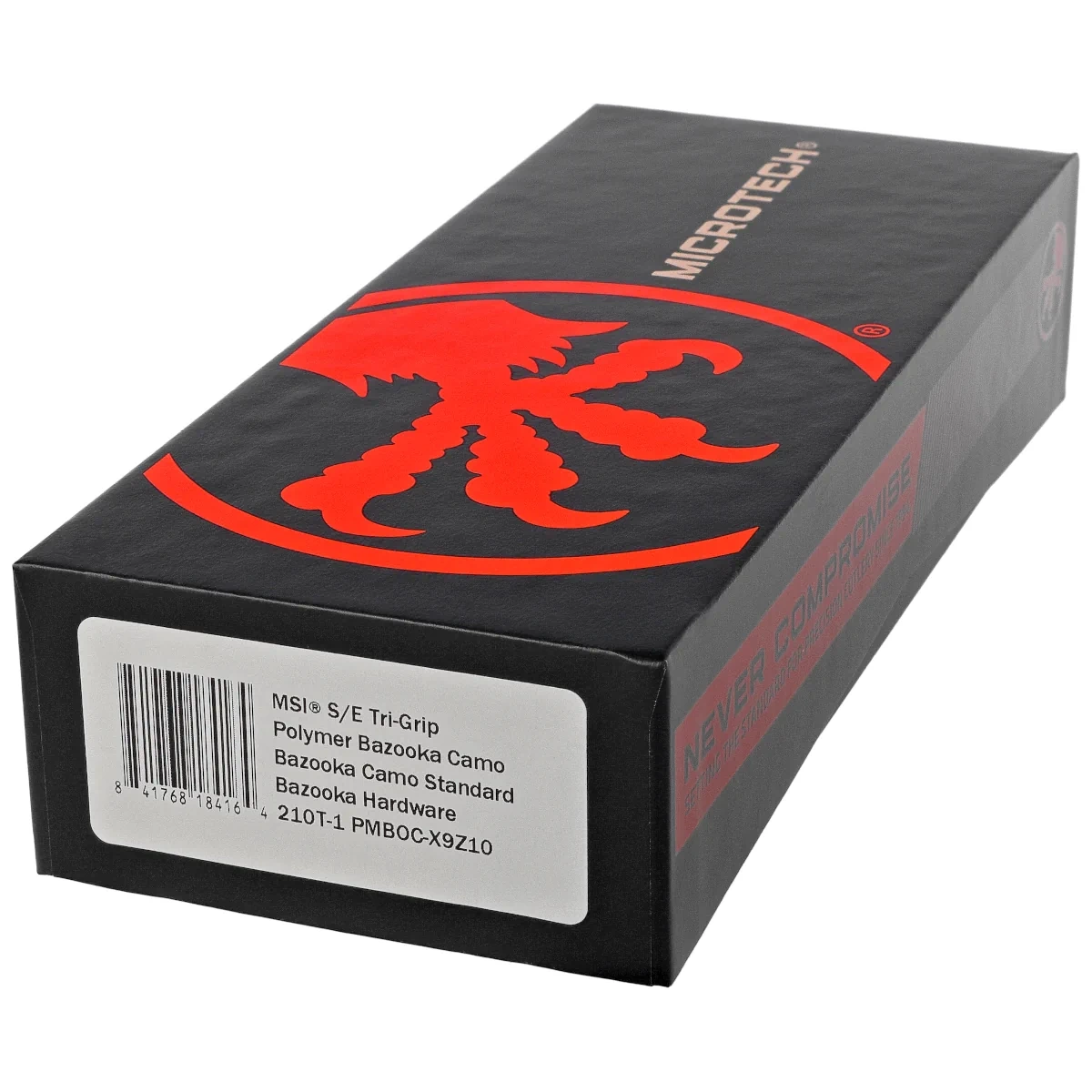 Rękojeść - wykonana z wytrzymałego polimeru w kamuflażu Bazooka Camo. Dla lepszego uchwytu pokryta fakturą Tri-Grip. Szeroki suwak blokady z charakterystyczną dla firmy Microtech schodkową strukturą X. Obie okładziny zostały skręcone przy pomocy solidnego, aluminiowego backspacera. Dwustronny (prawa / lewa) klips pozwala dyskretnie nosić nóż w pozycji tip-up. Nad klipsem lanyard hole, miejsce na linkę zabezpieczającą lub ozdobną.