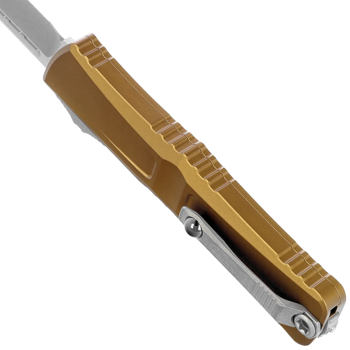 Rękojeść - wykonana z doskonałą precyzją w technologii 3D na frezarkach CNC, z pokrytego powłoką Mil-Spec aluminium 6061-T6. Faktura powierzchni rękojeści oraz głębokie nacięcia (jimping) na niej sprawiają, że nóż nie ślizga się w dłoni podczas używania. Smukły profil oraz frezowany dwupozycyjny (prawa/lewa) masywny klips typu deep carry, umożliwiają dyskretne przenoszenie noża w kieszeni, w pozycji tip-down (czubkiem ostrza do dołu). Wyposażony w gładką kulkę rollerball, dzięki której nóż z łatwością wsuwa się do kieszeni nie niszcząc brzegów kieszeni. Na klipsie znajduje się logo Microtech i data produkcji. Rękojeść zakończono zbijakiem do bicia szyb, stalowy trójkąt, w który wprasowano kulkę z węglika wolframu.