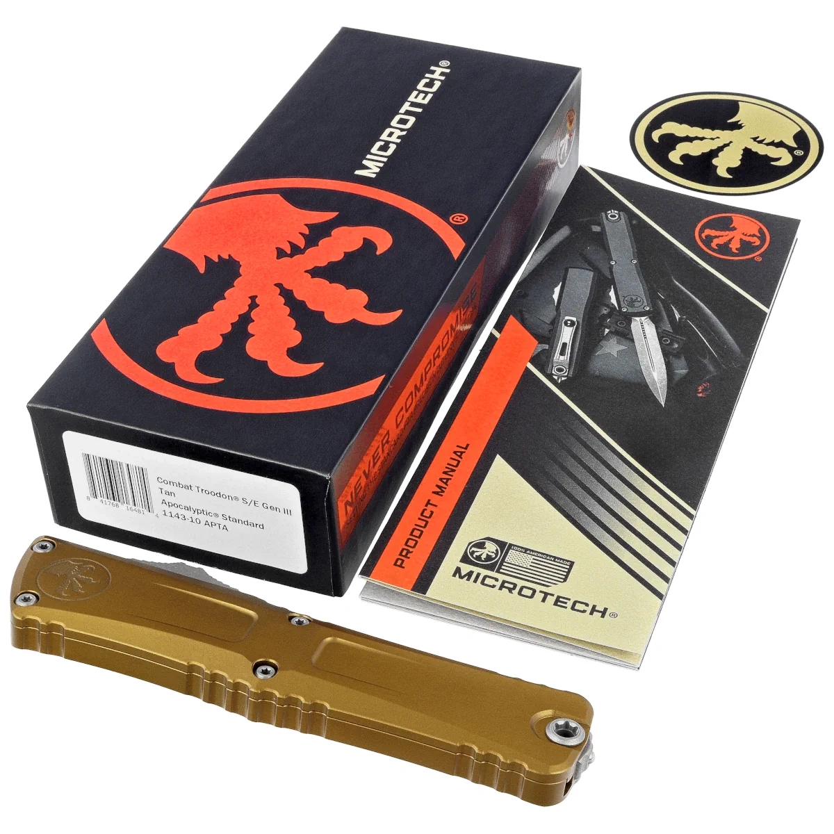 Combat Troodon Gen III S/E Tan Aluminium, Apocalyptic ten największy z noży automatycznych, to szczyt precyzyjnej inżynierii i taktycznej sprawności w dziedzinie noży OTF (Out The Front). Zbudowany z myślą o szerokim spektrum zastosowań użytkowych, może pochwalić się większym o 25% rozmiarem w porównaniu do flagowego Troodona. Precyzyjnie wykonany, wyposażony w wyrafinowany i piekielnie szybki mechanizm wysuwający ostre jak brzytwa ostrze. W 100% wyprodukowany i zmontowany w USA. Projekt Anthony'ego Marfione, knifemakera i właściciela Microtech Knives.