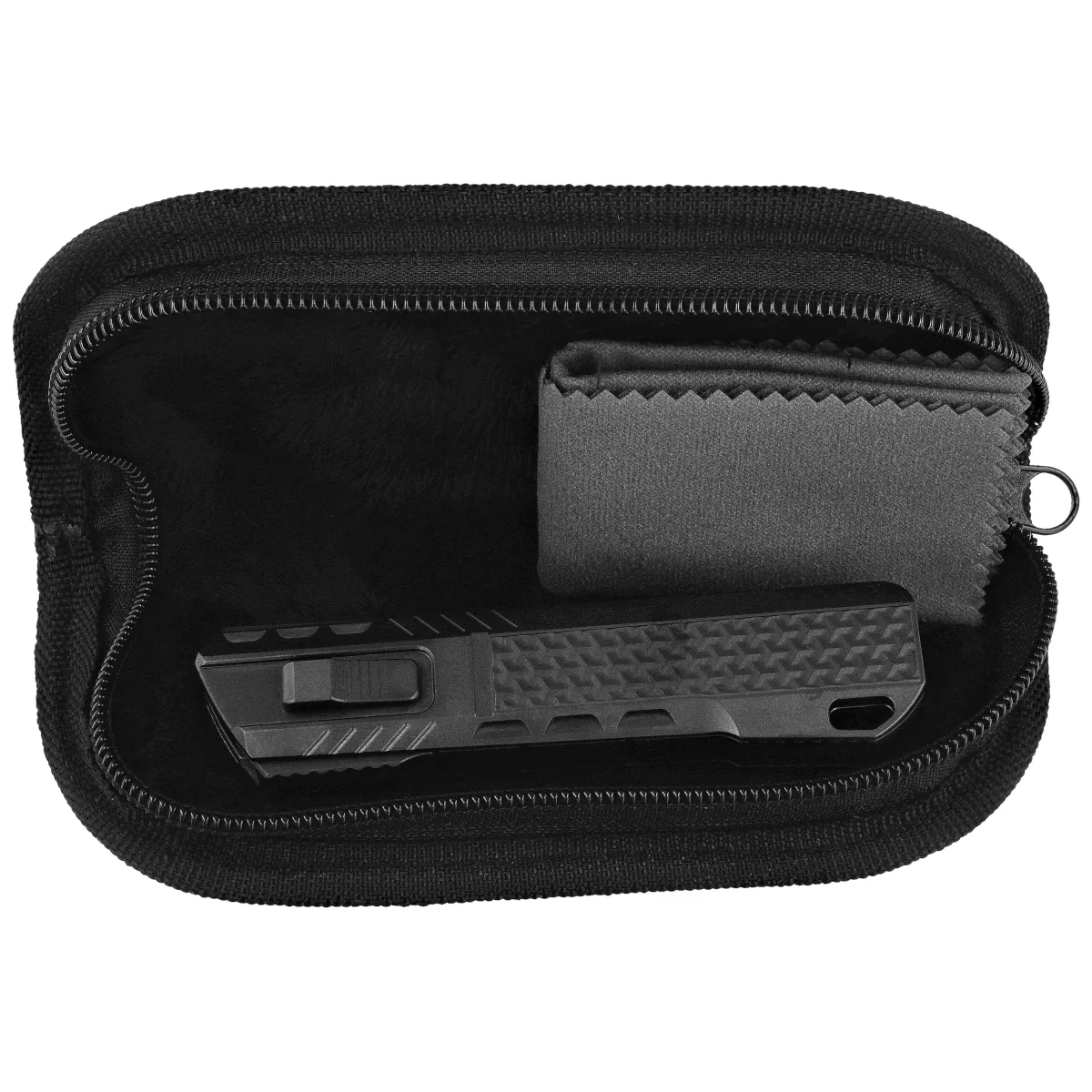 - RT-Sharp Leopard Black DLC Titanium, Black DLC kompaktowy folder EDC z młodej manufaktury Remette Knives. OTF z wysuwanym dzięki sile grawitacji ostrzem. Wygodna rękojeść z tytanu z nowatorskim systemem uwalniania ostrza.
