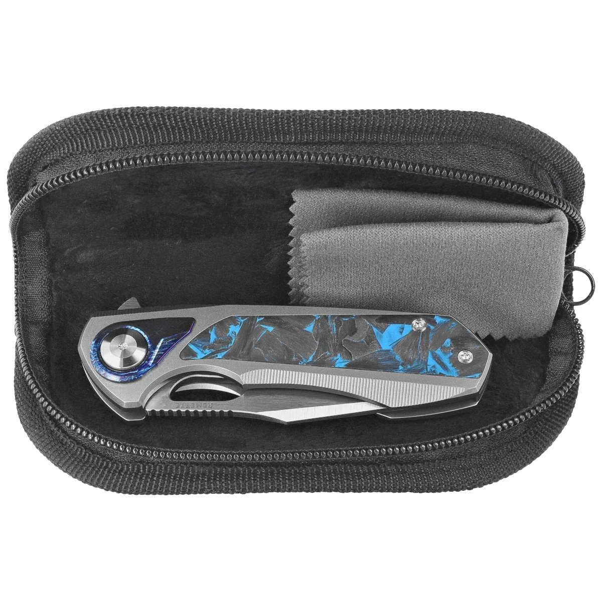 Rękojeść - korpus z tytanu został wzmocniony eleganckimi wkładkami z carbon fiber two-tone, które wpływają zarówno na wizualny balans projektu, jak i ergonomię chwytu. Zastosowane frezowania poprawiają trakcję i zwiększają komfort operowania nożem, a fazowane krawędzie ułatwiają manewrowanie narzędziem przy różnych kątach chwytu. Blokada button frame lock działa płynnie, z wyczuwalnym punktem zapadania, zapewniając bezpieczeństwo i szybkość obsługi. Uzupełnieniem konstrukcji jest klips deep carry, który umożliwia niskoprofilowe, dyskretne przenoszenie foldera.