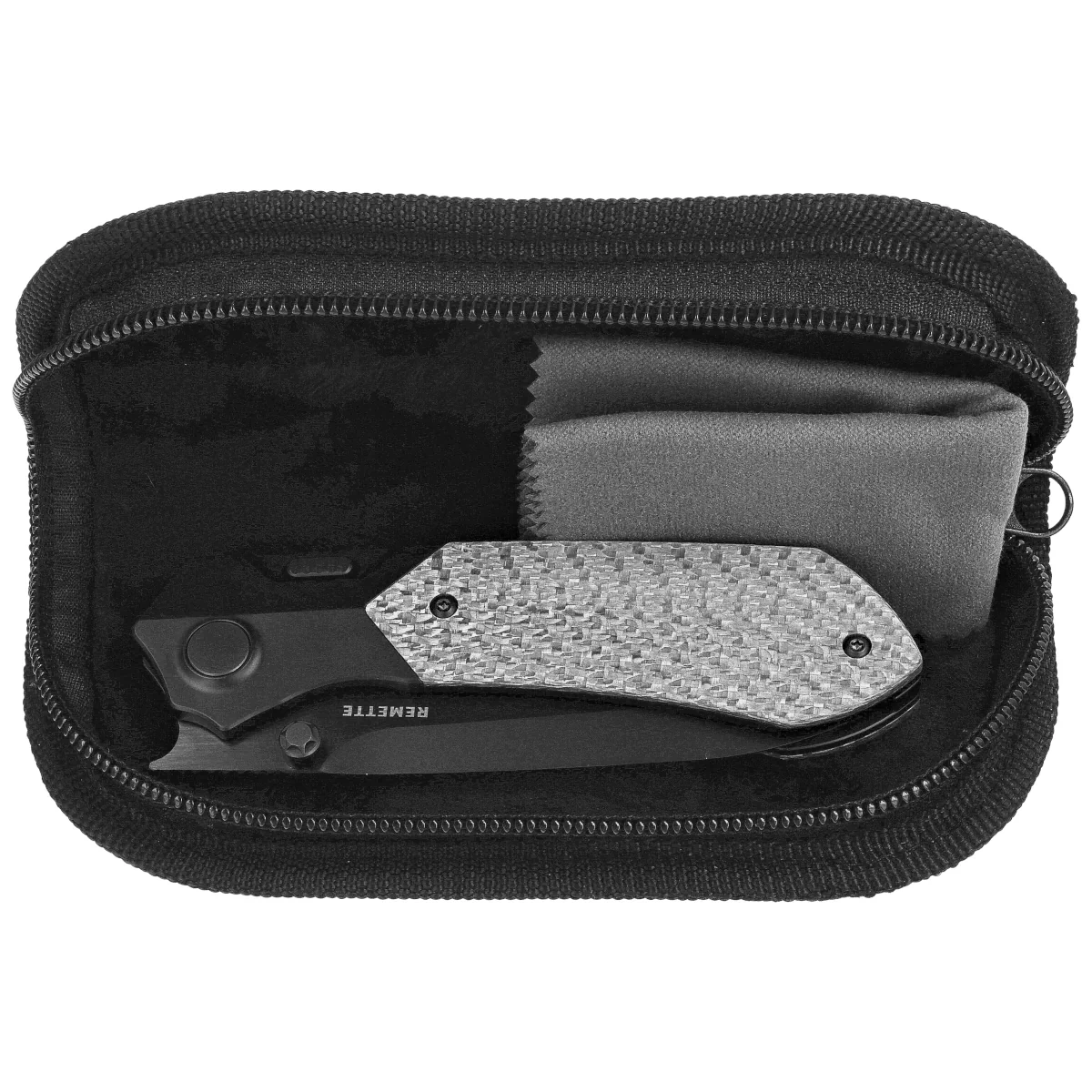 Rękojeść -  z tytanu, zaprojektowana z myślą o maksymalnej trwałości i czystości formy technicznej. Stabilna budowa eliminuje punkty osłabiające, a wkładki z carbon fiber pełnią funkcję zarówno estetyczną, jak i ergonomiczną, poprawiając chwyt i redukując masę. Wyprofilowane krawędzie oraz starannie dopracowane proporcje uchwytu wspierają stabilność operacyjną i komfort długotrwałego użytkowania. Klips mocujący umożliwia wygodne i dyskretne przenoszenie, nie zaburzając linii projektu. Konstrukcja rękojeści oddaje ducha estetyki technologicznej, która wpisuje się w DNA marki Remette.