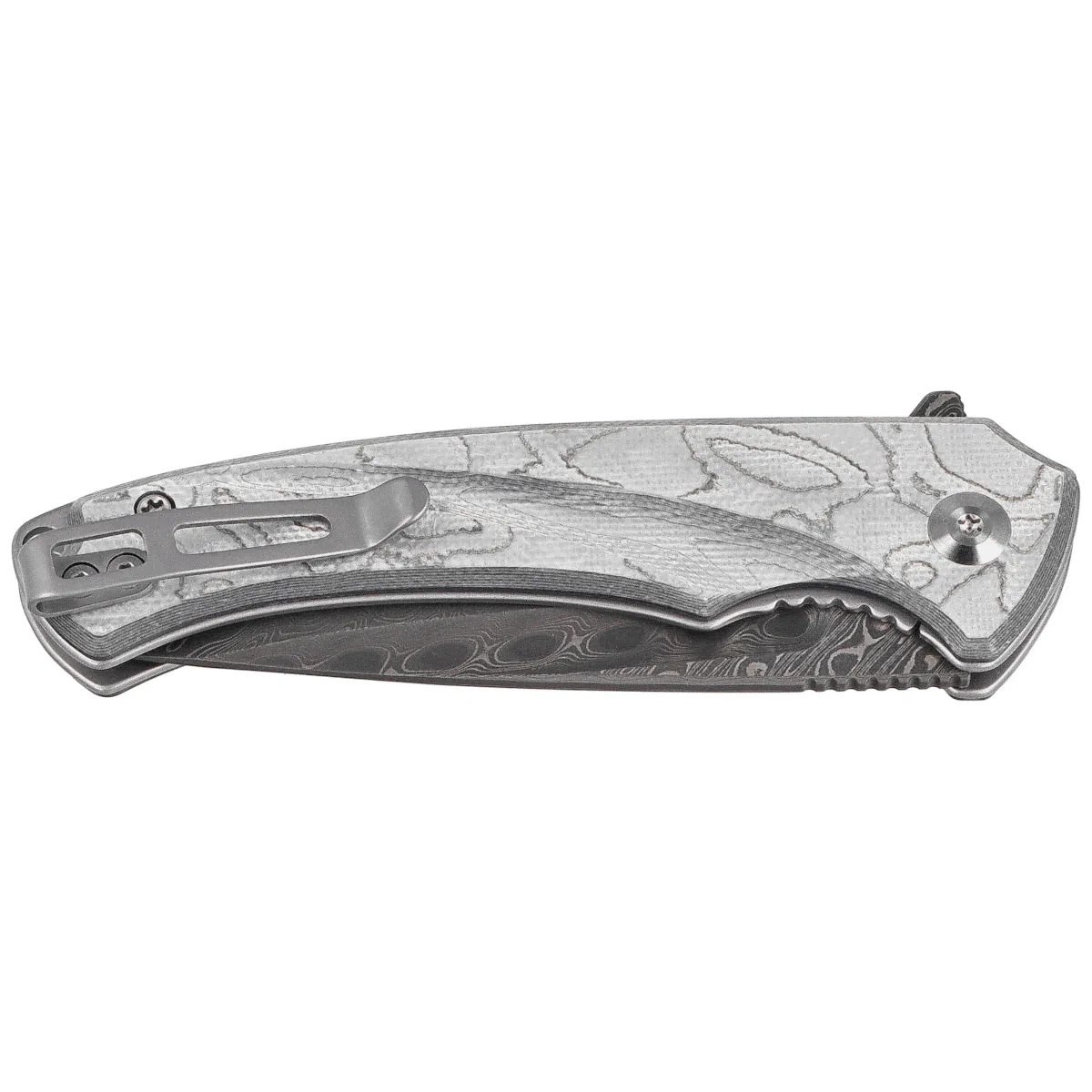 Głownia - typu drop point została wykonana z wytrzymałego nierdzewnego damastu, oferującego dobrą retencję ostrości, odporność na rdzę oraz łatwość ostrzenia. Szlif wklęsły zapewnia precyzyjne prowadzenie ostrza, a trawienie acid etched podkreśla linię wzorów stali. Otwieranie odbywa się za pomocą flippera, który w połączeniu z łożyskami ceramicznymi gwarantuje aksamitnie płynny ruch ostrza – bez oporu, bez hałasu, z natychmiastową gotowością do działania.
