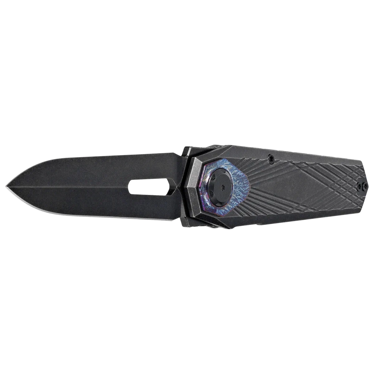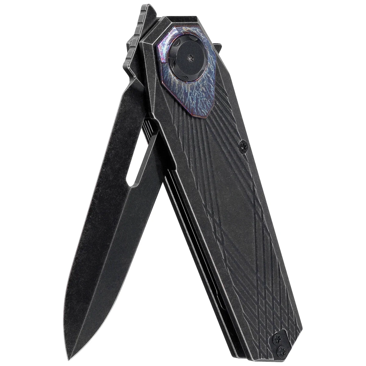 Rękojeść - z tytanu 6AL-4V wyróżnia się minimalistycznym wzornictwem i wyważoną konstrukcją, zapewniając ergonomię, trwałość i niską masę. Frezowane linie zwiększają przyczepność i dodają charakteru technicznego, a precyzyjnie zaoblone krawędzie dbają o komfort chwytu. Dekoracyjna wkładka wokół pivotu podkreśla detal wykonania, łącząc walory estetyczne z symboliką custom designu. Blokada typu button liner lock gwarantuje sztywność i bezpieczeństwo użytkowania, a klips deep carry pozwala na wygodne noszenie noża w kieszeni. Z tyłu backspacera znajduje się również lanyard hole – praktyczny element zwiększający możliwości przenoszenia i personalizacji.