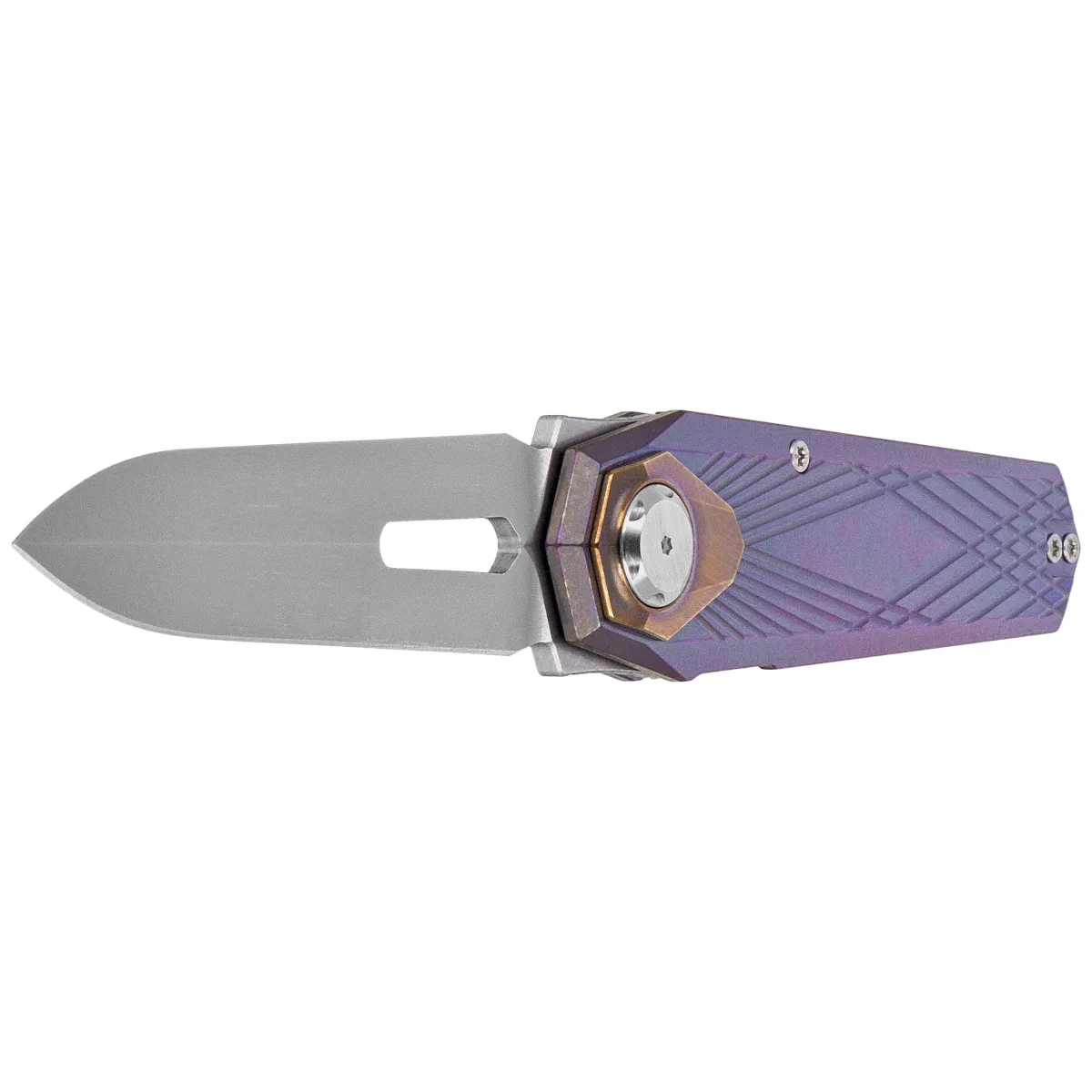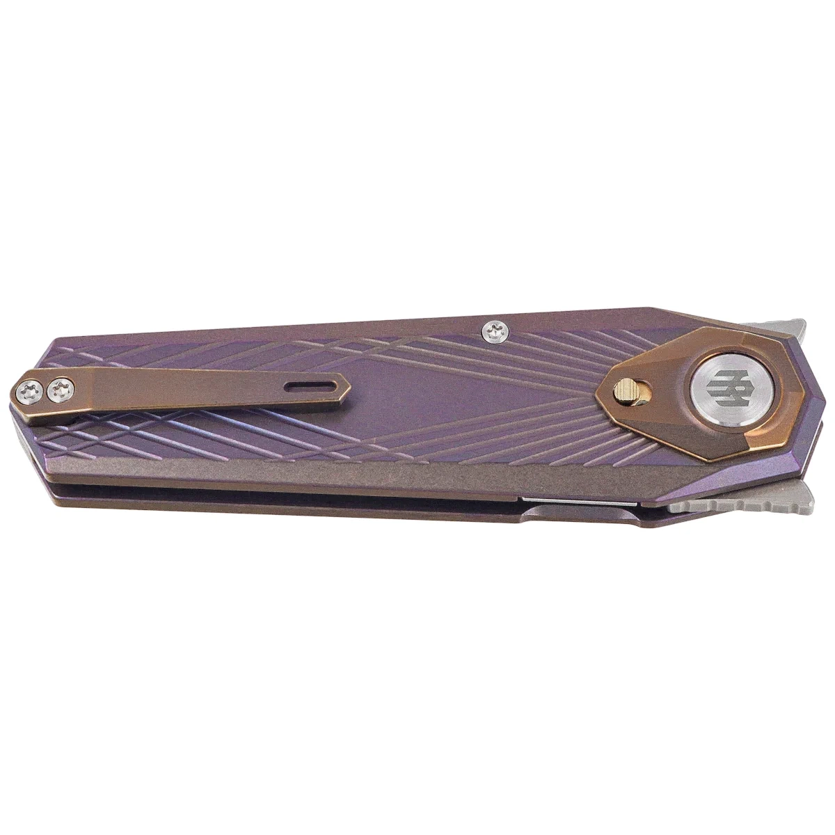Rękojeść - z tytanu 6AL-4V wyróżnia się minimalistycznym wzornictwem i wyważoną konstrukcją, zapewniając ergonomię, trwałość i niską masę. Frezowane linie zwiększają przyczepność i dodają charakteru technicznego, a precyzyjnie zaoblone krawędzie dbają o komfort chwytu. Dekoracyjna wkładka wokół pivotu podkreśla detal wykonania, łącząc walory estetyczne z symboliką custom designu. Blokada typu button liner lock gwarantuje sztywność i bezpieczeństwo użytkowania, a klips deep carry pozwala na wygodne noszenie noża w kieszeni. Z tyłu backspacera znajduje się również lanyard hole – praktyczny element zwiększający możliwości przenoszenia i personalizacji.