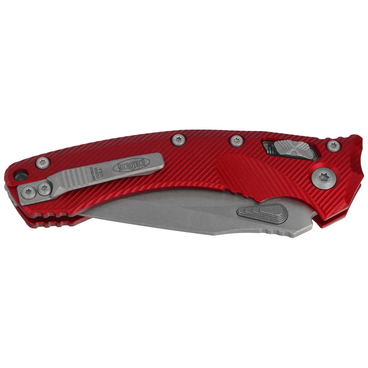 Rękojeść - wykonana z doskonałą precyzją w technologii 3D na frezarkach CNC, z pokrytego powłoką Mil-Spec aluminium 6061-T6, dla lepszego uchwytu pokryta wyfrezowanymi liniami (Fluted). Szeroki suwak blokady z charakterystyczną dla firmy Microtech schodkową strukturą X. Obie okładziny zostały skręcone przy pomocy solidnego, backspacera. Dwustronny (prawa / lewa) tytanowy klips pozwala dyskretnie nosić nóż w pozycji tip-up. Nad klipsem lanyard hole, miejsce na linkę zabezpieczającą lub ozdobną.