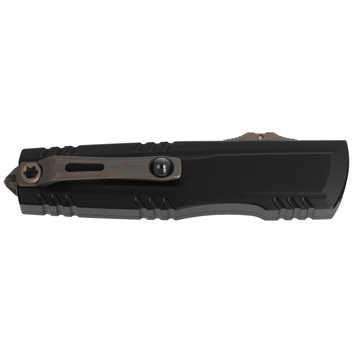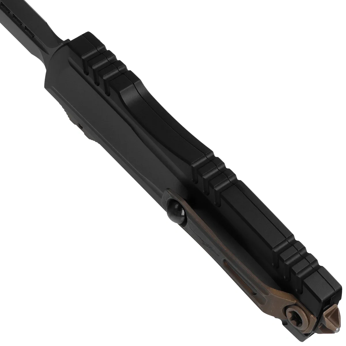 Rękojeść - wykonana z doskonałą precyzją w technologii 3D na frezarkach CNC, z pokrytego twardą powłoką Mil-Spec aluminium 6061-T6. Na rękojeści głęboko grawerowane logo Microtecha, szpon drapieżnego ptaka. Faktura powierzchni rękojeści powoduje, że nóż nie ślizga się w dłoni podczas używania. Na grzbiecie i dole rękojeści znajdują się nacięcia (jimping) dla pewniejszego chwytu. Innowatorska, bezśrubowa konstrukcja rękojeści. Smukły profil oraz frezowany dwupozycyjny (prawa/lewa) masywny, tytanowy klips typu deep carry, umożliwiają dyskretne przenoszenie noża w kieszeni, w pozycji tip-down (czubkiem ostrza do dołu). Wyposażony w gładką kulkę rollerball, dzięki której nóż z łatwością wsuwa się do kieszeni nie niszcząc brzegów kieszeni. Rękojeść zakończono nową wersją zbijaka do szyb, stalowa piramida, w którą wprasowano kulkę z węglika wolframu. Z tyłu rękojeści otwór do przeplecenia linki ozdobnej.