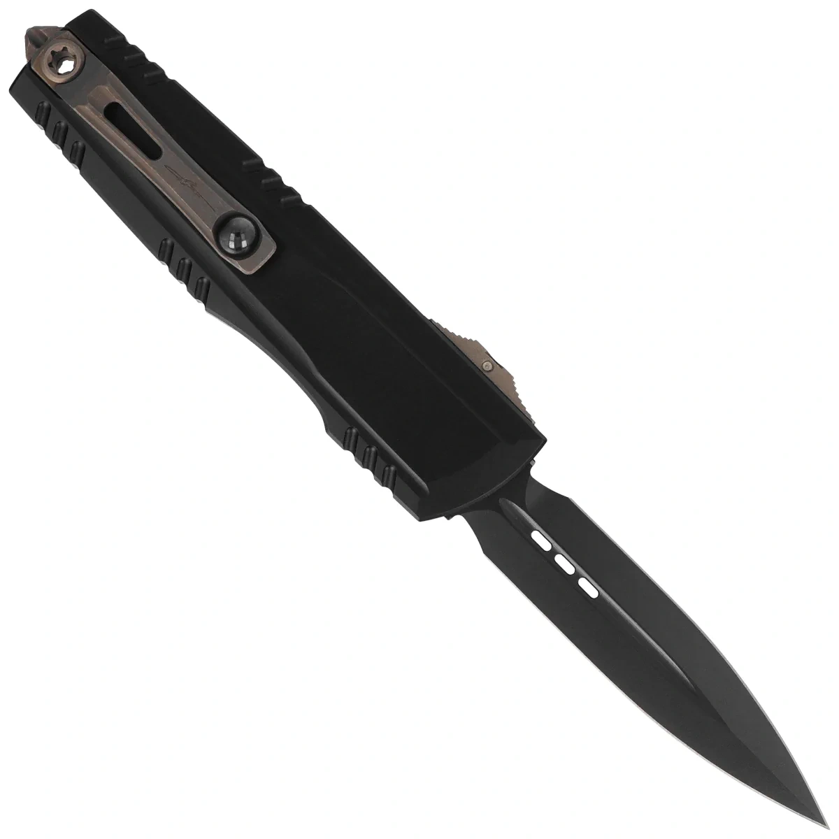 Głownia - szlifowana maszynowo D/E (Double Edge) typu Dagger, obustronnie ostrzona. Pokryta czarną powłoką DLC. Ostrze wyprowadzono wysokim szlifem płaskim (Flat Grind), zapewniającym doskonałe właściwości tnące. Dzięki temu przy zachowaniu dużej wytrzymałości nóż ma znakomite właściwości przy przebijaniu. Mocny mechanizm wysuwania / chowania klingi za pomocą moletowanego Thumb Slide, schodkowego suwaka pod kciuk wymaga dla bezpieczeństwa przyłożenia konkretnej siły do pokonania oporu sprężyny. W suwaku została umieszczona wkładka z trytem, świecąca w ciemności, dla łatwiejszego znalezienia noża po ciemku. Sposób otwierania zapewnia bezproblemowe otwarcie osobom prawo, jak i leworęcznym.