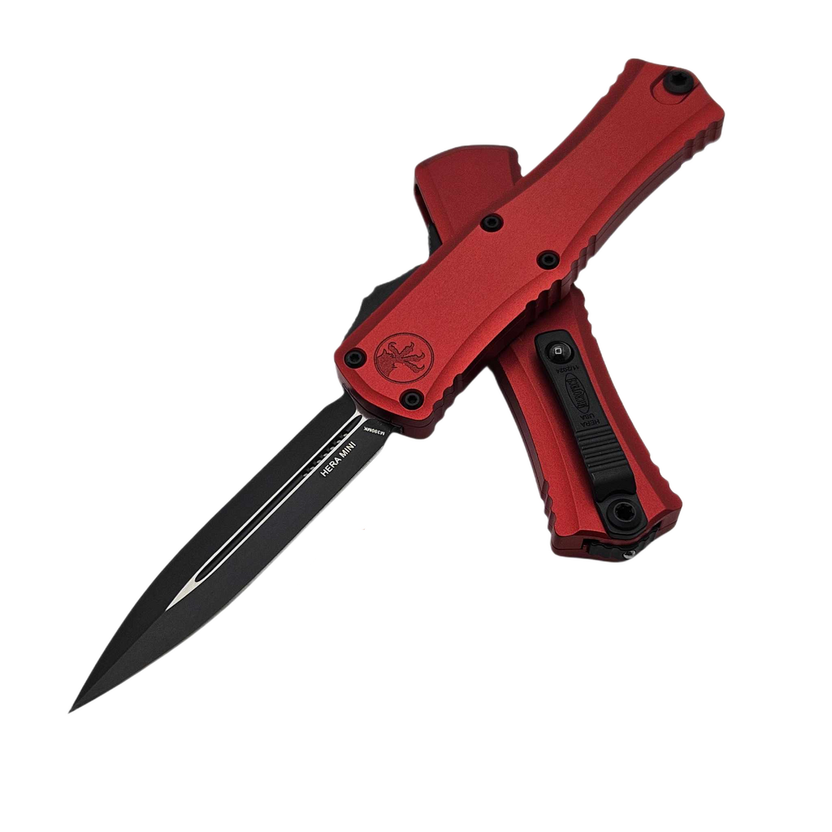 - Hera 2 Mini D/E Red Aluminium, Black kompaktowa wersja jednego z najlepszych noży OTF inpirowana modelem Troodon. Lekki i wygodny w przenoszeniu, przy zachowaniu mocy oraz osiągów większych modeli. Projekt A. Marfione właściciela Microtech Knives.