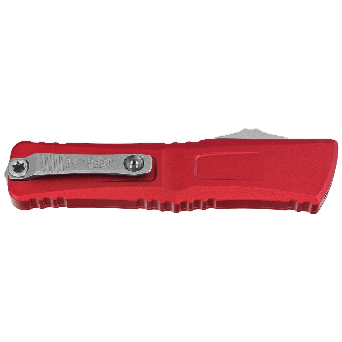 Rękojeść - wykonana z doskonałą precyzją w technologii 3D na frezarkach CNC, z pokrytego powłoką Mil-Spec aluminium 6061-T6Faktura powierzchni rękojeści oraz głębokie nacięcia (jimping) na niej sprawiają, że nóż nie ślizga się w dłoni podczas używania. Smukły profil oraz frezowany dwupozycyjny (prawa/lewa) masywny klips typu deep carry, umożliwiają dyskretne przenoszenie noża w kieszeni, w pozycji tip-down (czubkiem ostrza do dołu). Wyposażony w gładką kulkę rollerball, dzięki której nóż z łatwością wsuwa się do kieszeni nie niszcząc brzegów kieszeni. Na klipsie znajduje się logo Microtech i data produkcji. Rękojeść zakończono zbijakiem do bicia szyb, stalowy trójkąt, w który wprasowano kulkę z węglika wolframu.