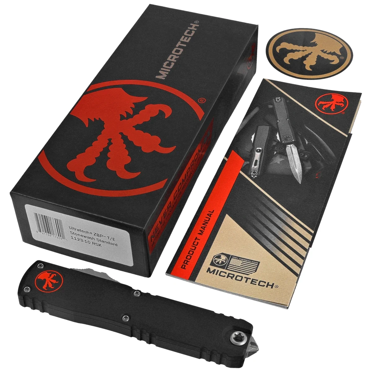 Ultratech T/E Gen III ZBP RSK Black Aluminum, Stonewashed to nowa odsłona serii Ultratech - pierwszy nóż OTF firmy Microtech bez jakiegokolwiek luzu ostrza po jego rozłożeniu!  Model wyróżnia się unikalnym wykończeniem w postaci czerwonego, głęboko grawerowanego symbolu szponów firmy Microtech, stanowiącymi znak rozpoznawczy tej serii. Automat z ostrzem "blade play free" wyróżnia się szeregiem usprawnień, takich jak; Crud Kutter™, Dual-Fuel Drive Train™, Zero Blade Play™. Przeprojektowano również rękojeść, wyposażając ją w rozwiązania znane z innych modeli. Pracujący w trybie D/A (Double Action), umożliwia błyskawiczne wysunięcie i schowanie ostrza za pomocą jednego ruchu kciuka. Projekt autorstwa Tony’ego Marfione, właściciela Microtech Knives, łączy w sobie nowoczesny design z najwyższą jakością wykonania