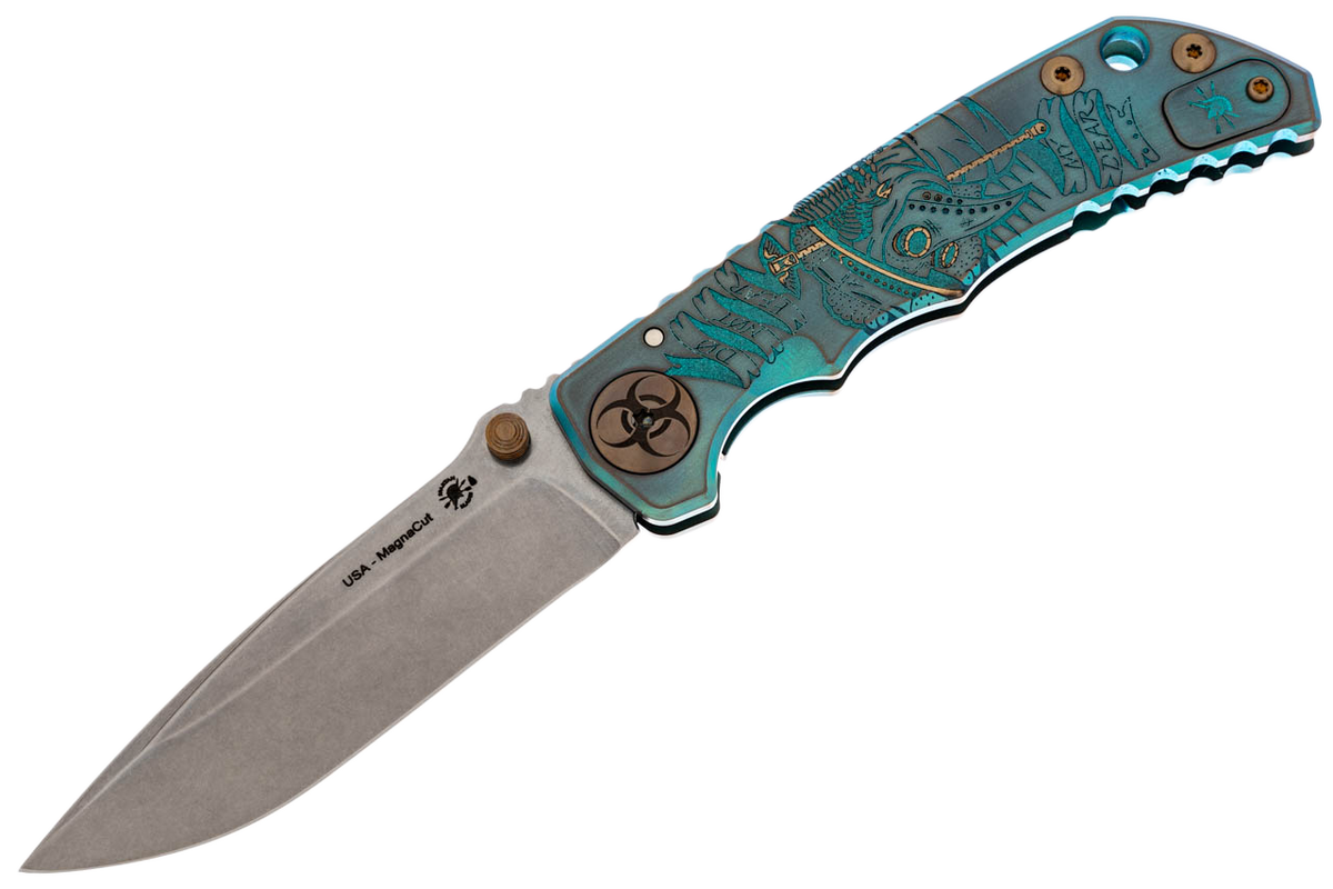Solidna rękojeść z tytanu ozdobiona jest artystycznym grawerunkiem "Plague Doctor". Dzięki odpowiednio wyprofilowanemu uchwytowi nóż pewnie leży w dłoni, zapewniając precyzję podczas wykonywania różnorodnych działań. Solidny mechanizm blokujący typu frame lock gwarantuje bezpieczne użytkowanie nawet w ekstremalnych warunkach. Każdy egzemplarz jest wykonywany ręcznie w USA, co czyni go wartościowym i poszukiwanym przedmiotem zarówno wśród kolekcjonerów, jak i wymagających użytkowników.