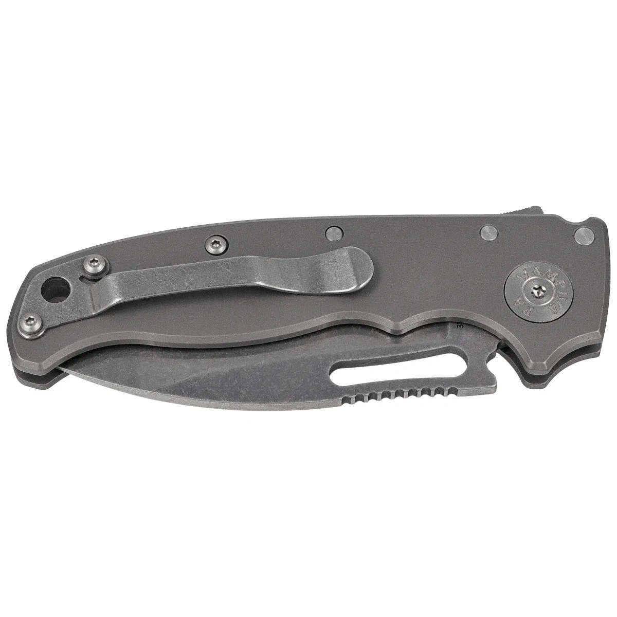 Rękojeść - okładziny z tytanu, wyróżniające się lekkością, sztywnością i odpornością na warunki zewnętrzneProfilowane podcięcia wspierają pewny chwyt, także w rękawicach. Stalowe tuleje dystansowe zwiększają sztywność całej konstrukcji, a klips deep carry umożliwia wygodne i dyskretne przenoszenie w kieszeni. Dodatkowo w zestawie klips na lewą stronę, dla osób leworęcznych. Elementy montażowe w systemie Torx upraszczają demontaż i serwisowanie noża. Shark-Lock™, umieszczony w górnej części rękojeści, działa błyskawicznie, zapewniając pełną kontrolę i bezpieczeństwo, niezależnie od preferowanego chwytu czy dominującej ręki.
