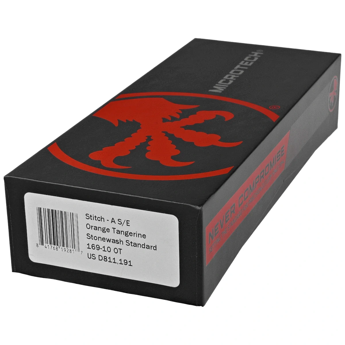 Stitch-A S/E Orange Tangerine Tri-Grip Aluminium, Stonewashed automatyczna wersja śmiałego projektu wszechstronnego noża taktycznego, efekt współpracy Sebastijana Berenji i firmy Microtech. Szeroka głownia i prosta, wygodna w każdym chwycie rękojeść dają mocny nóż taktyczny wykonany z dbałością o najdrobniejsze szczegóły i z najlepszych materiałów. Wierny towarzysz, który nigdy nie zawiedzie