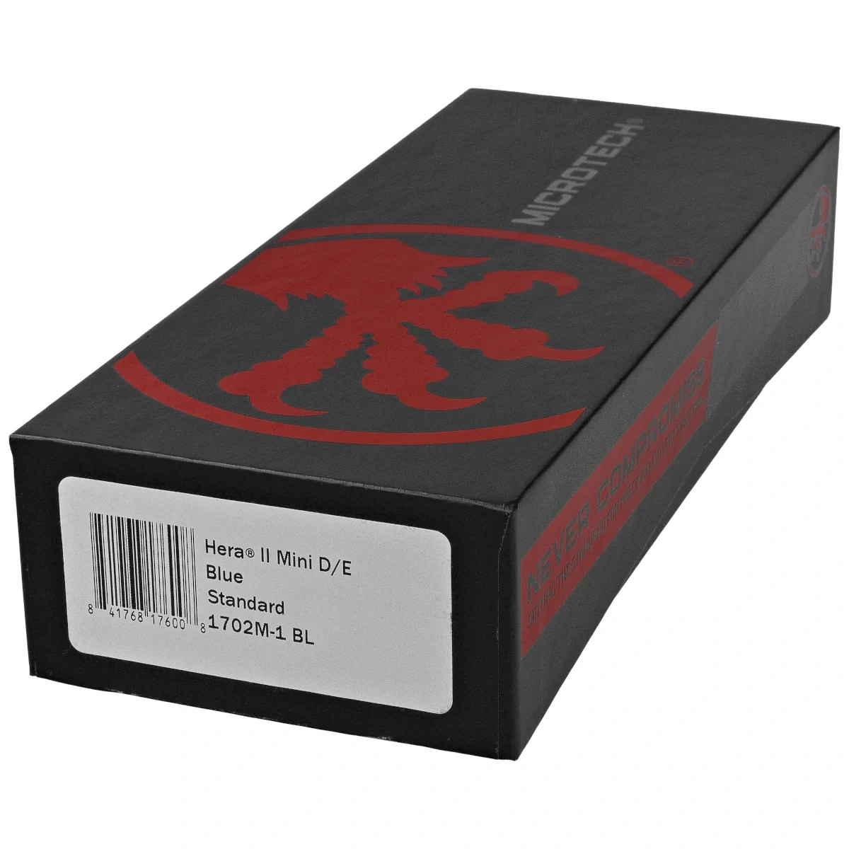 Hera II Mini D/E Blue Aluminium, Black jeden z najbardziej wszechstronnych noży automatycznych OTF (Out The Front). Wzorowany na kultowym modelu Troodon, stanowi ogniwo pośrednie pomiędzy modelami EDC a konstrukcjami stricte taktycznymi. Automat o ponadprzeciętnej wytrzymałości z mechanizmem działającym w trybie D/A (Double Action) zapewniając szybkie, mocne i pewne wysuwanie oraz chowanie ostrza. Model wyróżnia się doskonałym spasowaniem elementów i najwyższą jakością wykończenia. Projekt autorstwa Anthony'ego Marfione, uznanego knifemakera i właściciela Microtech Knives.