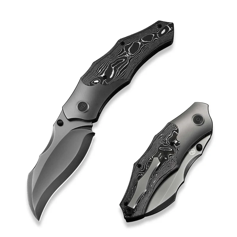 Głownia - o profilu Hawkbill, wykonana z proszkowej stali CPM 20CV. Wykończenie polished gray ogranicza widoczność drobnych zarysowań i refleksów, nadając klindze surowy, techniczny wygląd. Agresywnie poprowadzony profil ostrza z dynamiczną krzywizną sprzyja precyzyjnemu prowadzeniu cięcia, a równocześnie oferuje zapas materiału w kluczowych strefach roboczych, zwiększając stabilność całej konstrukcji. Precyzyjny szlif mieszany wspiera płynne wejście w materiał, a odpowiednia grubość grzbietu zapobiega skręcaniu ostrza i wspiera pewność cięcia pod obciążeniem. Zastosowany thumb stud umożliwia intuicyjne, kontrolowane otwieranie ostrza, zapewniając pełną płynność działania i zgodność z wysokimi standardami WE Knife.