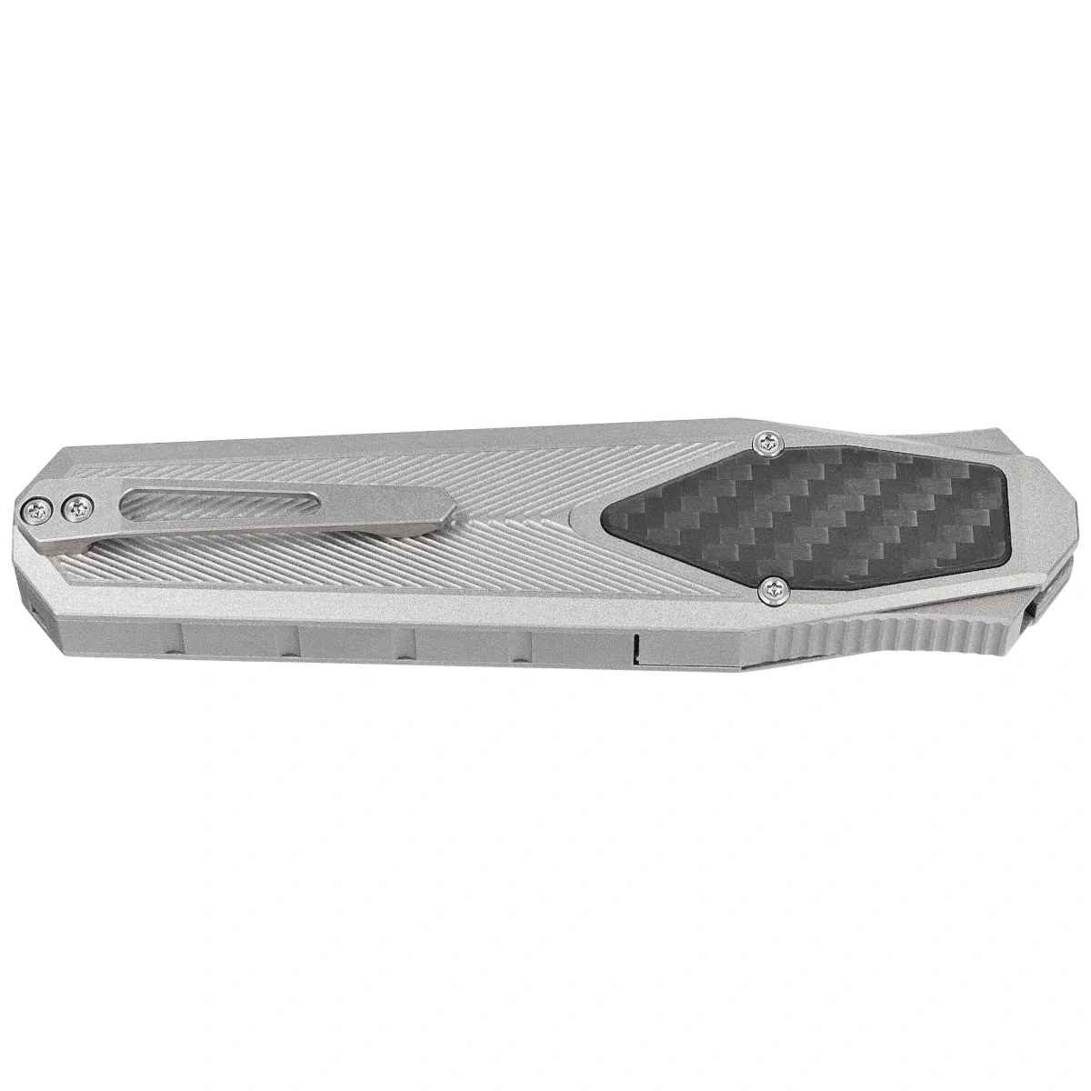 Rękojeść - wykonana na frezarkach CNC z aluminium, z trójwymiarową teksturą. Fazowane krawędzie okładek eliminują ostre ranty, a perfekcyjnie dopasowana wkładka (inlay) z kompozytu Carbon Fiber nadają ekskluzywnego charakteru oraz poprawiają pewność uchwytu. Po prawej stronie kunsztowny suwak do wysuwania/wsuwania klingi. Jednopozycyjny tytanowy (prawa) klips deep carry umożliwia dyskretne przenoszenie noża w kieszeni w pozycji tip-down (czubkiem ostrza do dołu).