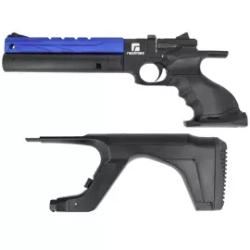 Reximex RP Blue, a sporty PCP pistol with a regulator for repeatable shots. Adjustable pin barrel and trigger tongue. Pressure vessel with a capacity of. 50cc. Anatomical handle with shelf with flask attachment option. Cal. 4.5mm, 5.5mm